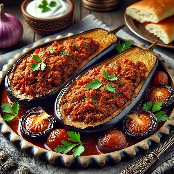 - پر کردن بادمجانها: بادمجانها را از آب نمک خارج کرده و خشک کنید. سپس مواد میانی را داخل بادمجانهای قایقی شکل بریزید.