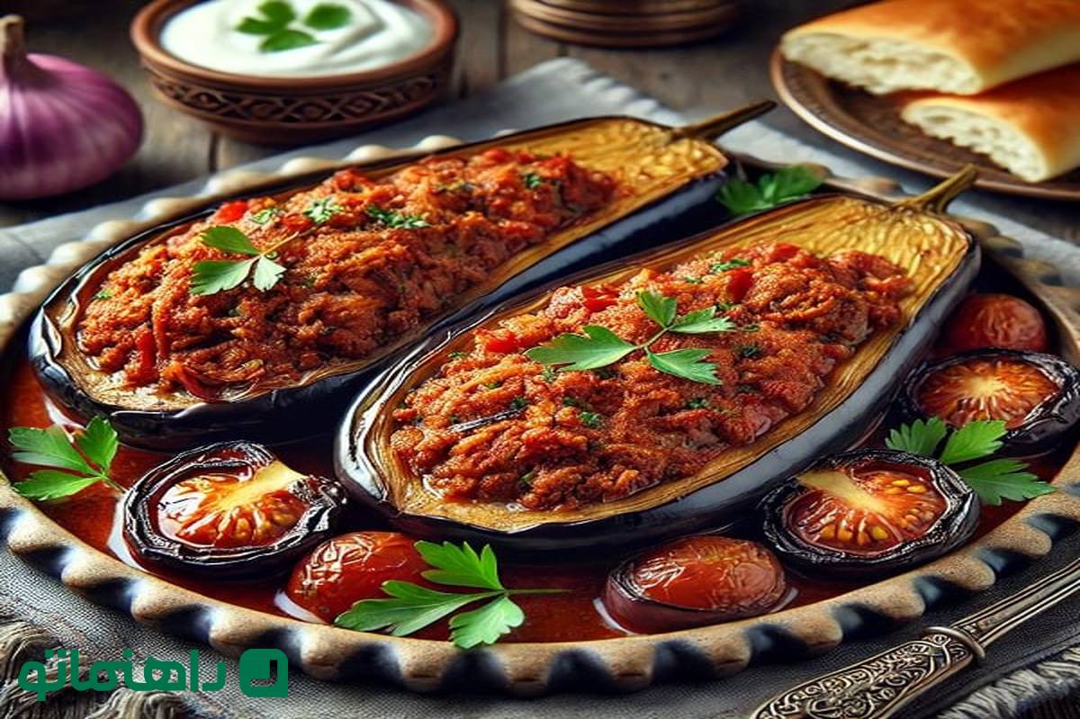 - پختن بادمجانها: بادمجانهای پر شده را در ظرف پیرکس چیده و در فر با دمای ۱۸۰ درجه سانتیگراد به مدت ۳۰ تا ۴۰ دقیقه بپزید تا بادمجانها نرم شوند و مواد داخل آنها جا بیفتد.