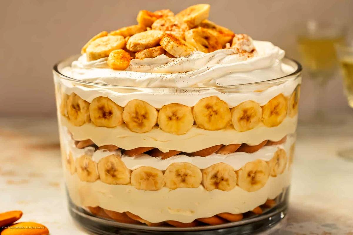 در این فاصله خامه قنادی را با همزن برقی بزنید تا فرم بگیرد، سپس کرم را از یخچال خارج کنید و به خامه فرم گرفته اضافه کنید و با همزن دستی هم بزنید تا مواد به صورت یکدست با هم مخلوط شوند. در مرحله آخر موزها را پوست و حلقه حلقه کنید. ظرف مورد نظر سرو دسر را انتخاب کنید. حالا یک لایه بیسکوییت کف ظرف بریزید و حلقههای موز را روی بیسکوییتها بچینید، سپس مایه کرم را روی مواد لایه موز و بیسکوییت بریزید و دوباره روی کرم بیسکوییت و موز بچینید و بعد باز هم لایهای از کرم بریزید. این کار را تا جایی ادامه بدهید که مواد دسر تمام شود. لایه رویی باید کرم باشد و روی کرم را با تکههای بیسکوییت و موز تزیین کنید. ظرف دسر را به مدت ۵ تا ۶ ساعت داخل یخچال بگذارید تا ببندد و جا بیفتد، سپس سرو کنید، نوش جان.