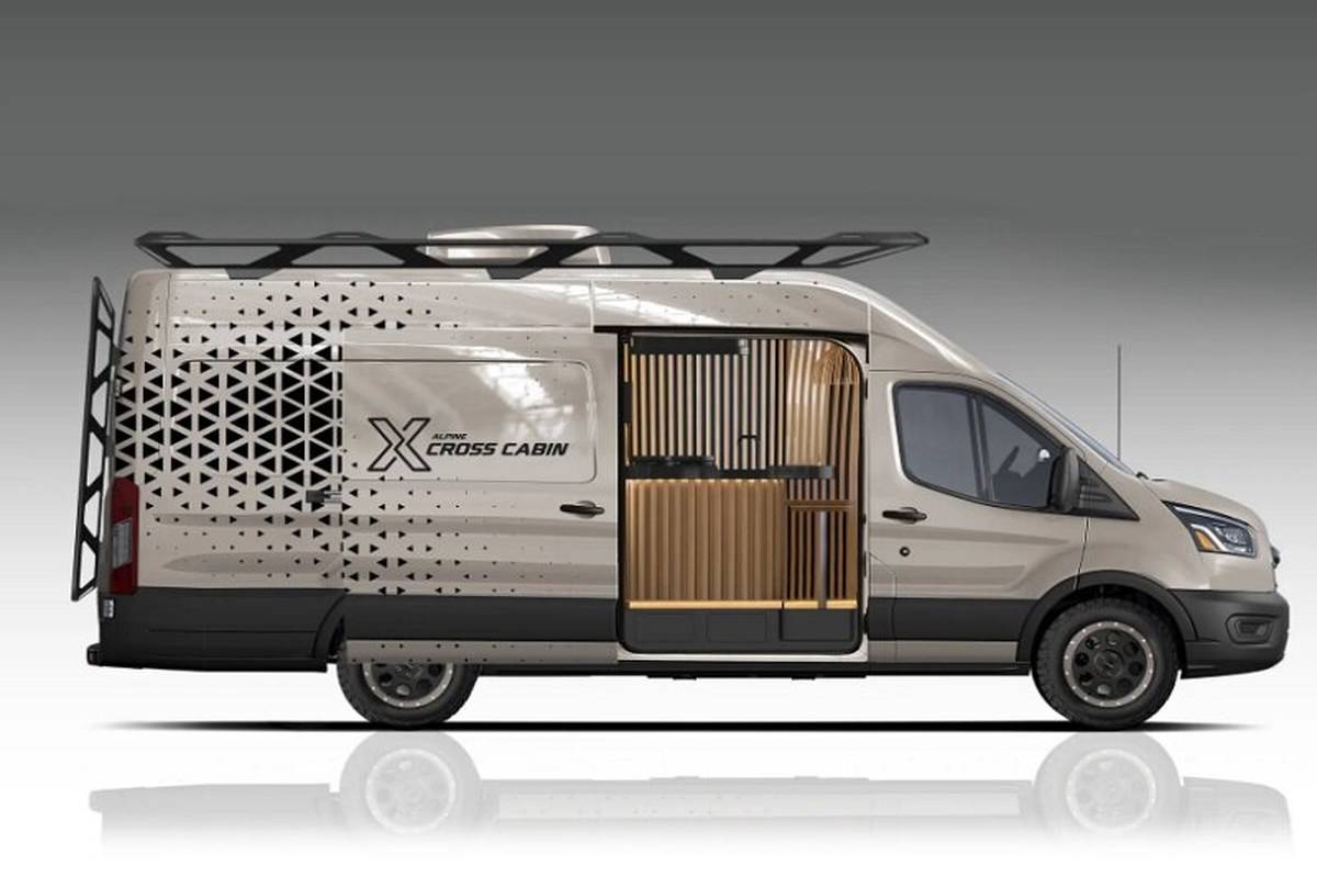 کل فضای داخلی «کراس کابین» بیشتر شبیه آثار هنری مجسمهسازی است تا فضای داخلی داخلی یک کاروان. آلپاین به جای مبلمان با لبههای دقیق، کابین ۶۷۰ سانتیمتری) فورد ترانزیت را با مجموعهای از دندههای بامبو میسازد و طراحی ایجاد میکند که شکاف بین مبلمان ساختاری و تزئینات زیبایی را از بین میبرد. دندهها قفسهها، نورپردازی و تجهیزات صوتی را با زیبایی هر چه بیشتر پنهان میکنند و خطوط دقیق در عقب نیمکتهای یکپارچه را در مقابل یکدیگر قرار میدهند.