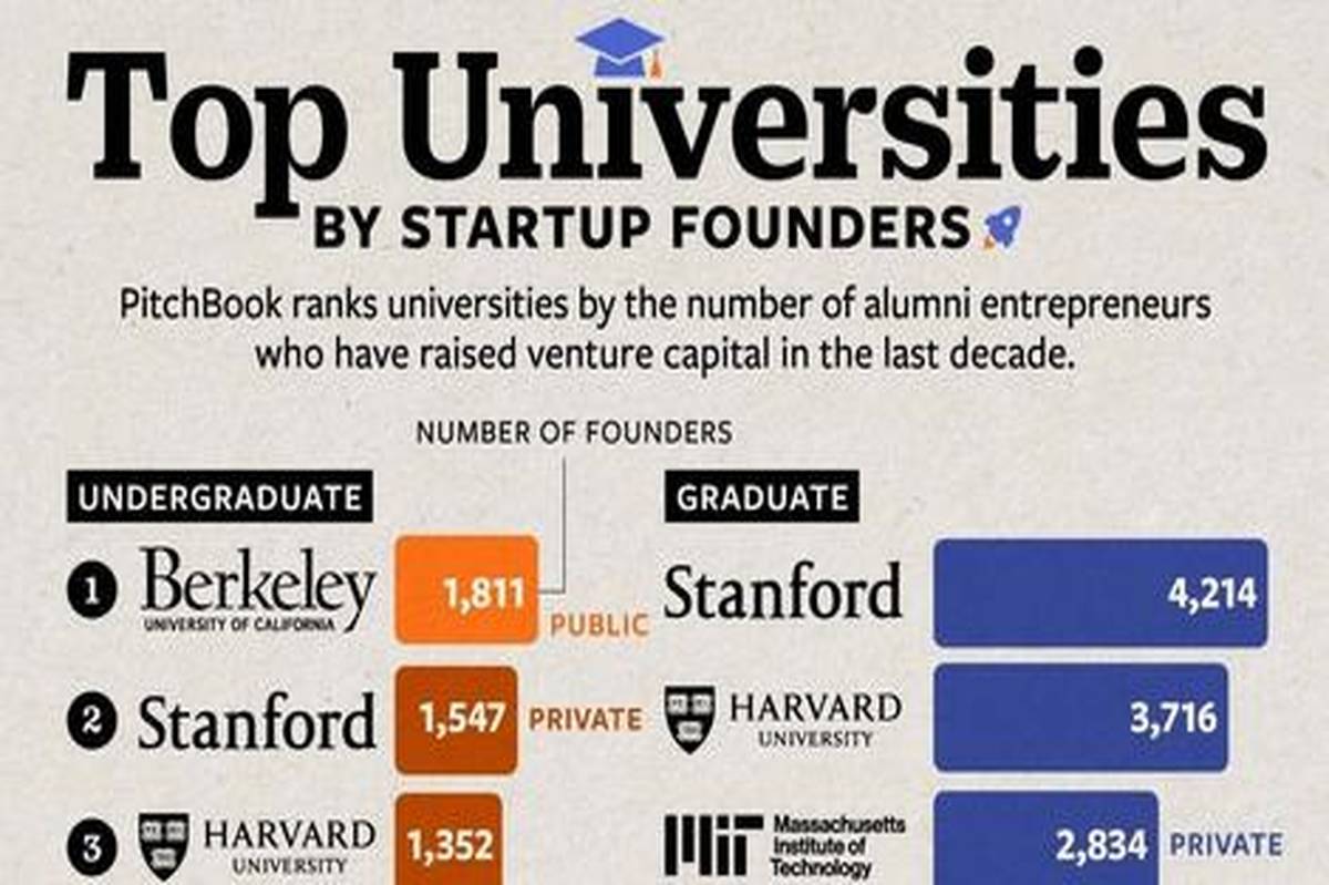 نمودار زیر ۱۰ دانشگاه برتر در مقاطع کارشناسی و تحصیلات تکمیلی را بر اساس تعداد فارغ التحصیلانی که استارتاپ خود را تأسیس کردهاند، نشان میدهد. هر سال، PitchBook (یک شرکت تحقیقاتی در زمینه سرمایهگذاری خطرپذیر) دانشگاههای سراسر جهان را بر اساس تعداد کارآفرینان فارغ التحصیل که در دهه گذشته برای استارت آپ خود سرمایه جذب کردهاند را رتبهبندی میکند.