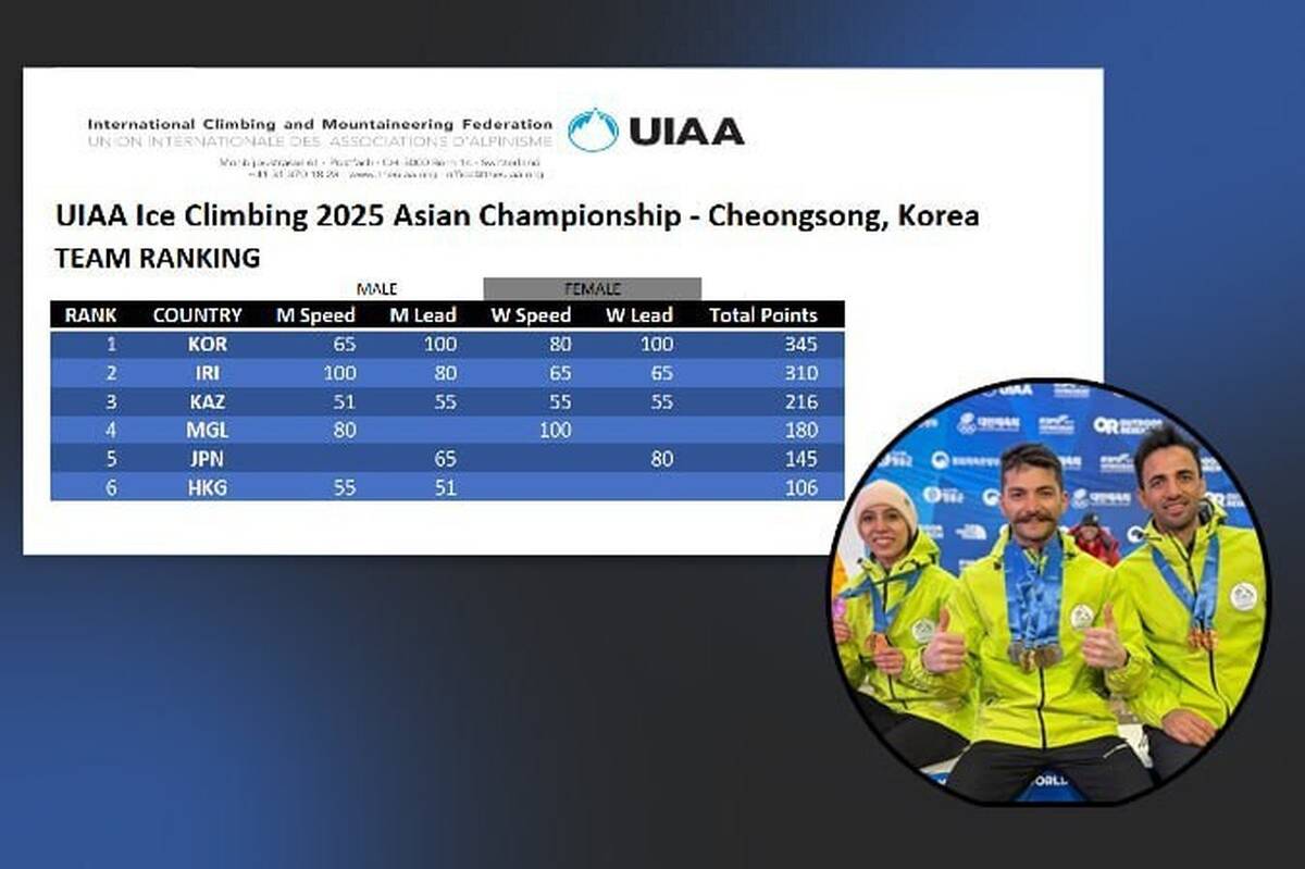 تیم ۳ نفره ملیپوشان یخ نوردی ایران متشکل از «شبنم اسدی»، «محمدرضا صفدریان» و «محسن بهشتی»، پس از حضور در رقابتهای جام جهانی و همزمان مسابقات قهرمانی آسیا در کرهجنوبی، با کسب هشت مدال رنگارنگ، در نهایت پس از تیم میزبان، در جایگاه دوم قهرمانی آسیا قرار گرفتند. قزاقستان، مغولستان، ژاپن و هنگکنگ نیز ردههای سوم تا ششم این مسابقات را از آن خود کردند. این رقابتها از ۲۲ تا ۲۴ دیماه ۱۴۰۳ در «چئونگ سونگ» کرهجنوبی برگزار شد و تیم ایران در مجموع صاحب ۸ مدال در دو رویداد جام جهانی و مسابقات قهرمانی آسیا شد.