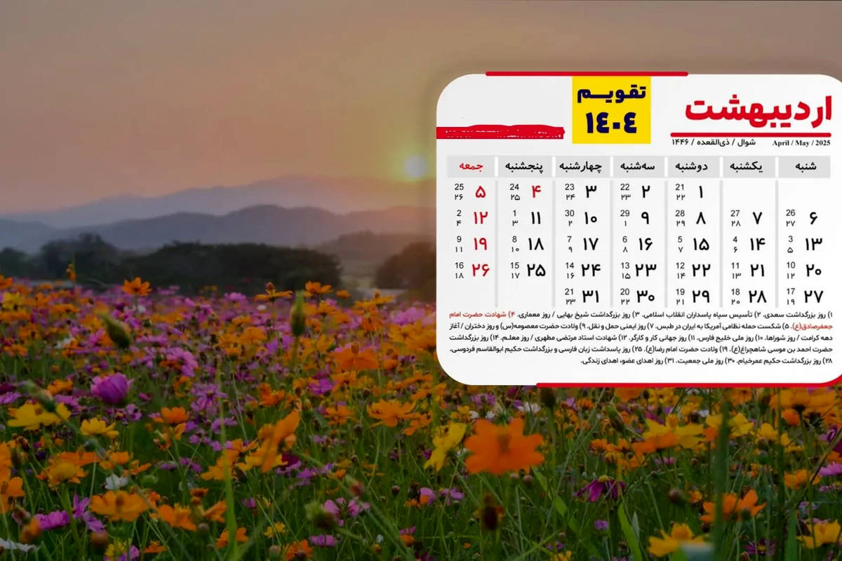 در تقویم اردیبهشت ۱۴۰۴، روز پنجشنبه ۴ اردیبهشت تعطیل اعلام شده است. این ماه، که دومین ماه سال و یکی از زیباترین دورههای فصل بهار است، علاوه بر زیباییهای طبیعیاش، شامل مجموعهای از مناسبتهای ملی، مذهبی و تاریخی نیز است؛ از جمله رویدادهای مهم این ماه میتوان به روز معلم، سالروز شکست حمله نظامی آمریکا در طبس، شهادت امام جعفر صادق (ع)، ولادت حضرت معصومه (س) و ولادت امام رضا (ع) اشاره کرد.