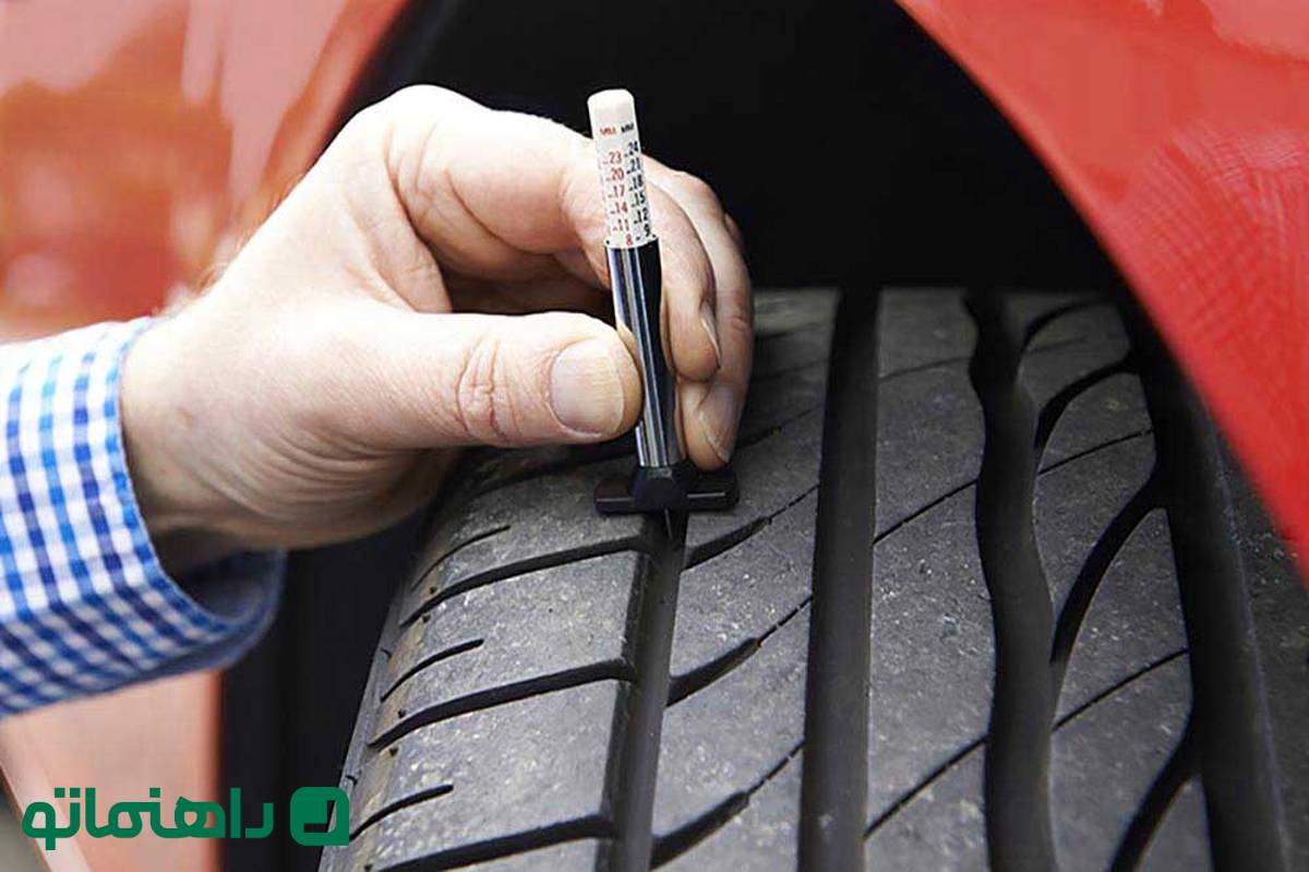 - ساییدگی آج: آج لاستیک نقش مهمی در چسبندگی خودرو به جاده، مخصوصاً در شرایط لغزنده، ایفا میکند. اگر عمق آج لاستیک به کمتر از حد مجاز (معمولاً 1.6 میلیمتر) برسد، باید لاستیکها را تعویض کنید. برای بررسی عمق آج میتوانید از دستگاه سنجش عمق آج یا شاخصهای تعبیه شده روی خود لاستیک استفاده کنید.