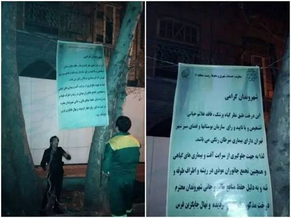 شهرداری منطقه ۱۱ در این اطلاعیه اعلام کرد: طبق پایش درختان با نظر گیاه پزشک، ۲ اصله درخت در خیابان فلسطین محدوده منطقه ۱۱ تهران درگیر آفت سرطان رنگی شده بودند که به مدت بیش از ۶ ماه عملیات درمانی گیاهی روی این دو اصله انجام شد اما علی رغم تلاش گیاه پزشکان، درخت دچار مرگ سرطان رنگی شد و فاقد علائم حیاتی بود که همزمان با برودت هوا و وزش باد در پایتخت و فصل پاییز به جهت خطرساز بودن برای مال و جان مردم و درخواست مکرر شهروندان ساکن و کسبه محدوده اقدامات قانونی برای رفع خطر از درخت با تایید سازمان بوستان ها و فضای سبز شهرداری تهران انجام شد و سرانجام از درخت مذکور رفع خطر شد.