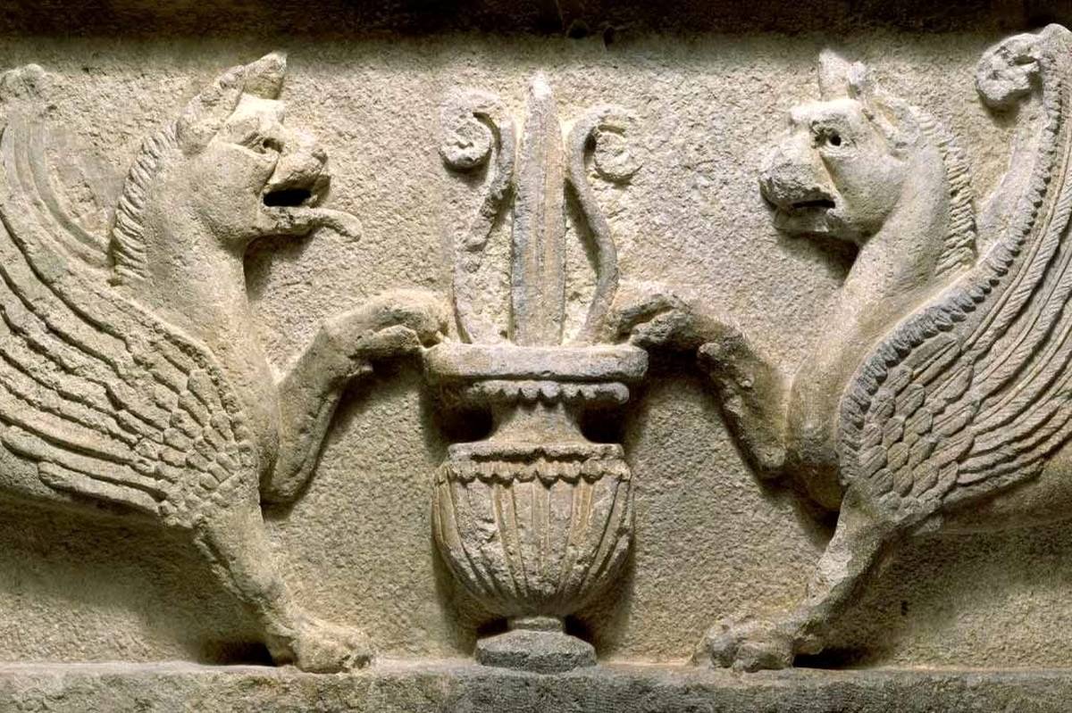 لنگه در با تصویر شیر دال و گلدانی با برگ نیلوفر آبی، اشکانی، قرن دوم تا اوایل قرن سوم میلادی