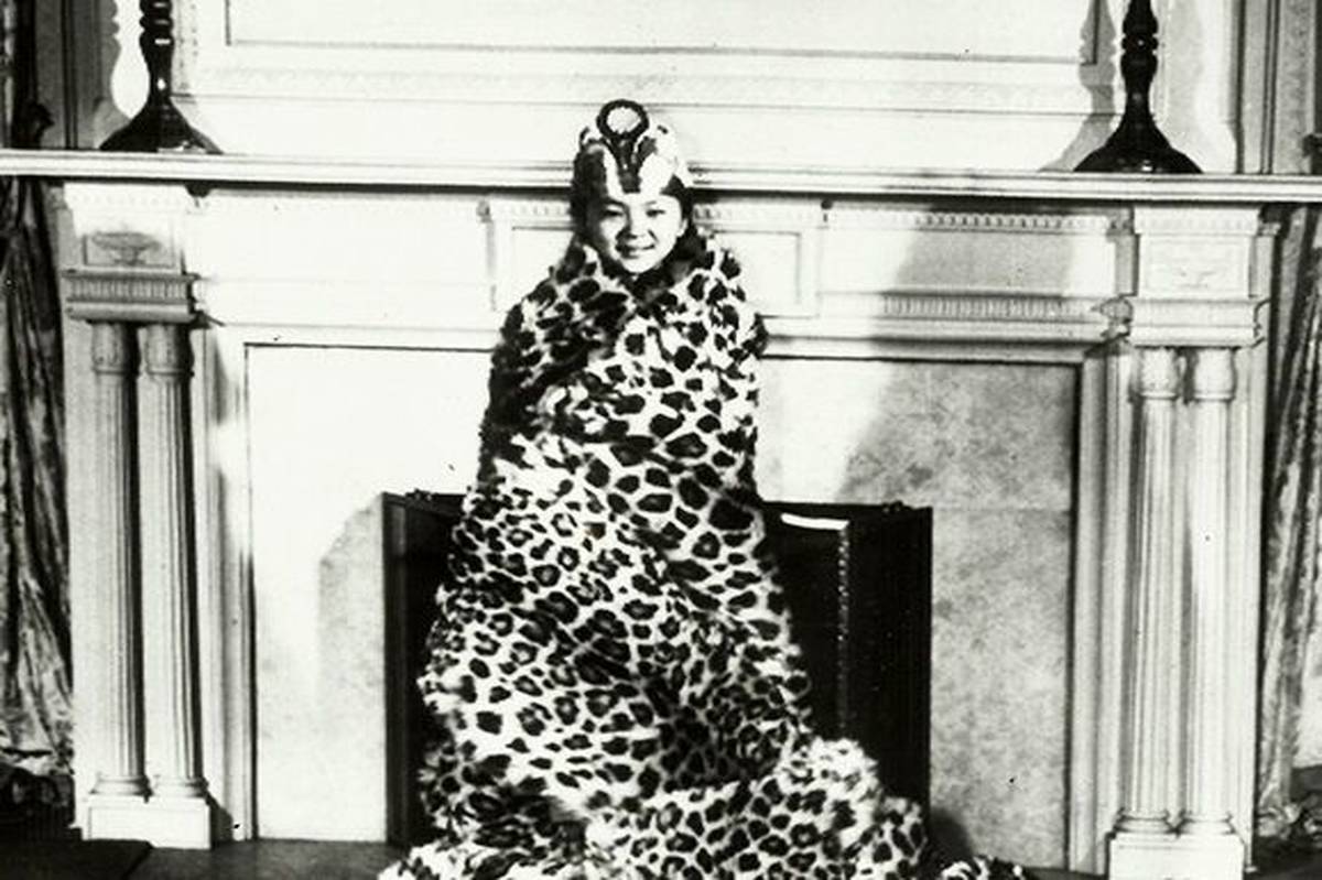 شیلا، دختر ۱۱ سالۀ یانگ یو-چان (سفیر کره جنوبی در ایالات متحده)، قالی معروف ساخته شده از پوست چندین پلنگ را به دور خود پیچیده است؛ گفته میشود که این قالی زمانی زینتبخش کاخ چانگدوک بوده است. تاریخ عکس: حدود سال ۱۹۵۲.