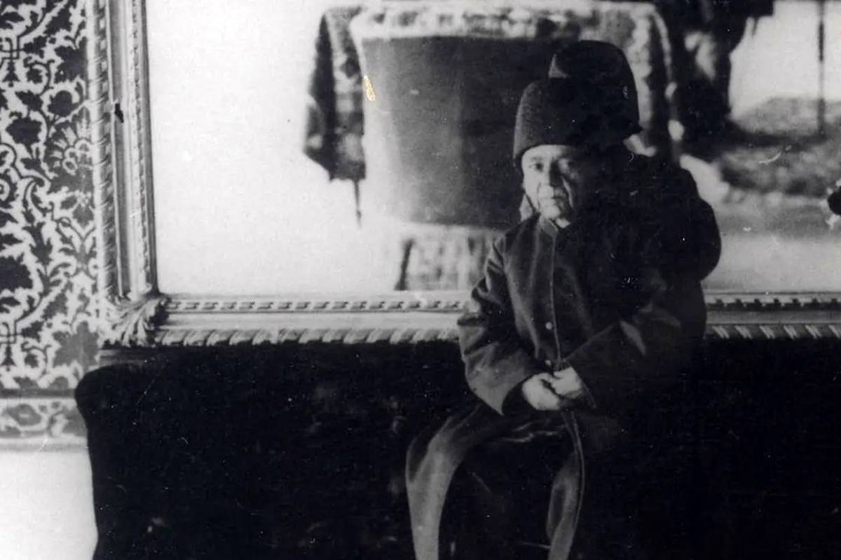 عکسی هنرمندانه از آغامحمدخان (از خواجههای حرمسرای ناصرالدین شاه) در تالار کاخ صاحبقرانیه؛ تصویر عکاس و دوربینش را هم میشود در آینۀ پشت سر آغامحمدخان دید.