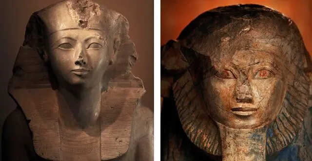عکس سمت چپ: مجسمه‌ی تصویرگر حتشپسوت با سربند فرعون