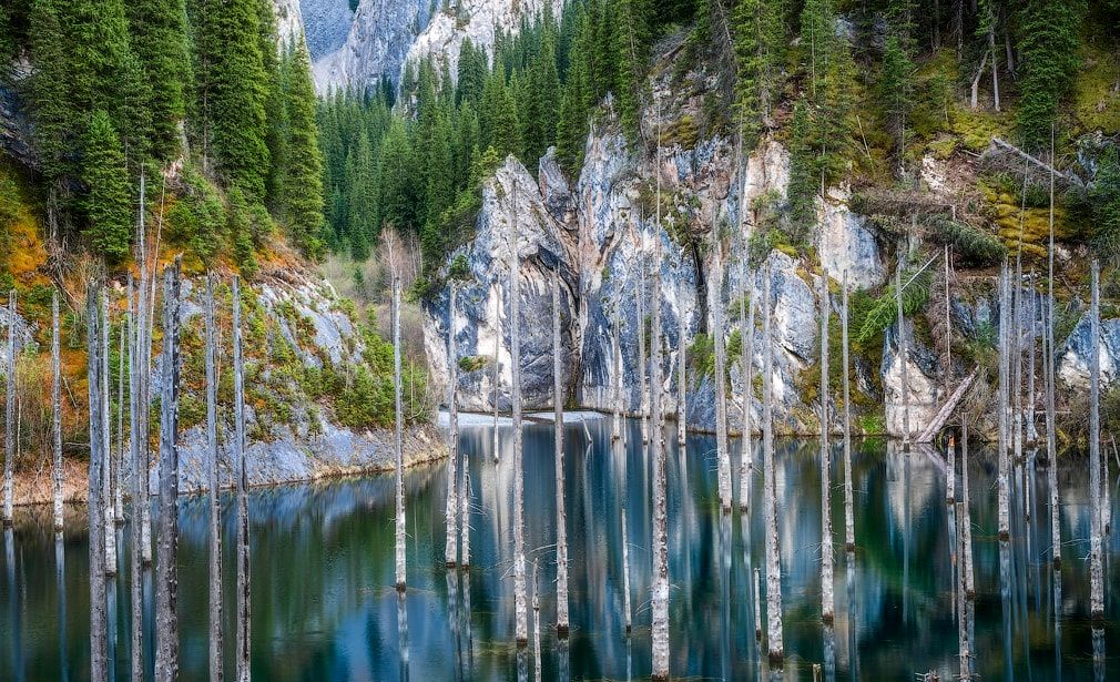 دریاچه کیندی در قزاقستان، حاصل زلزله‌ای است که طبیعت را دگرگون کرد. درختان صنوبر غرق‌شده در آب سرد و شفاف این دریاچه، پس از یک قرن همچنان ایستاده‌اند و منظره ای اسرارآمیز در دل کوه‌های تیان‌شان بوجود آورده اند.
