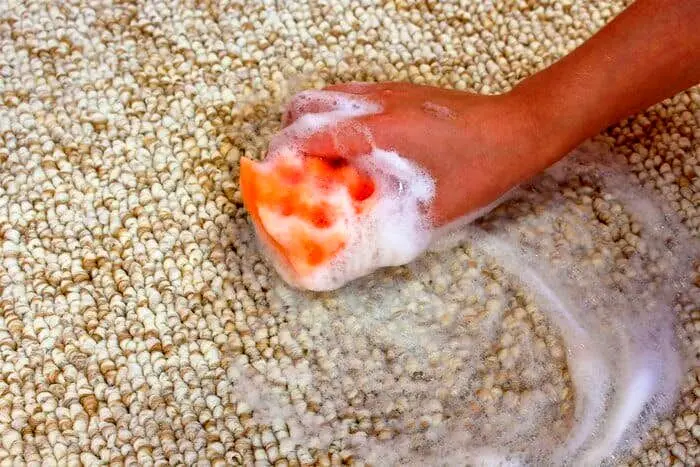 ابتدا جوش شیرین را روی لکه ها بریزید، پراکسید هیدروژن را با مایع ظرفشویی درون ظرفی مخلوط کنید و به تدریج به جوش شیرین اضافه کنید و سپس با مسواک یا برسی نرم روی لکه ها بمالید و با حوله یا دستمالی خشک آن را پاک کنید و به مدت 10-15 دقیقه صبر کنید و سپس آن قسمت را جاروبرقی بکشید. در صورت سرسخت بودن لکه ها این روش را تکرار کنید.