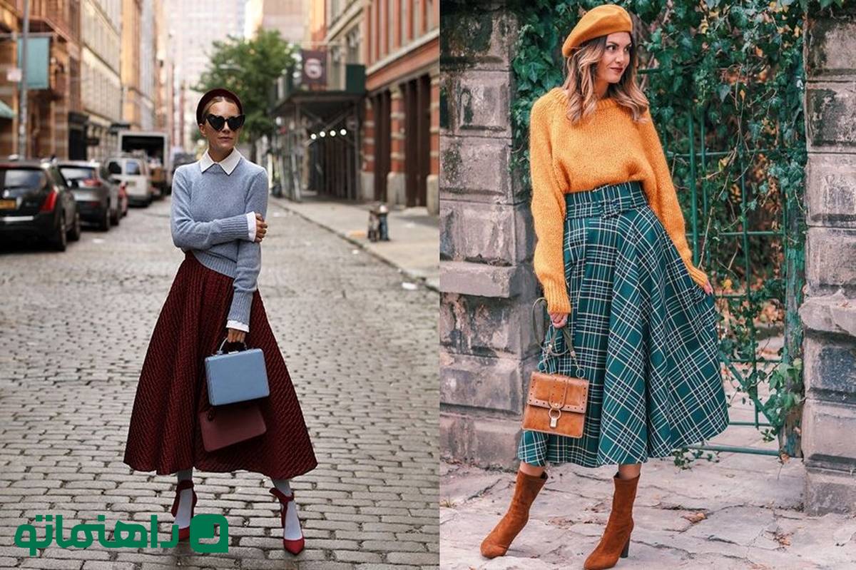 - لایه بندی: برای ایجاد یک لایه بندی زیبا، میتوانید یک سویشرت یا یک بلوز بافتنی زیر دامن خود بپوشید.