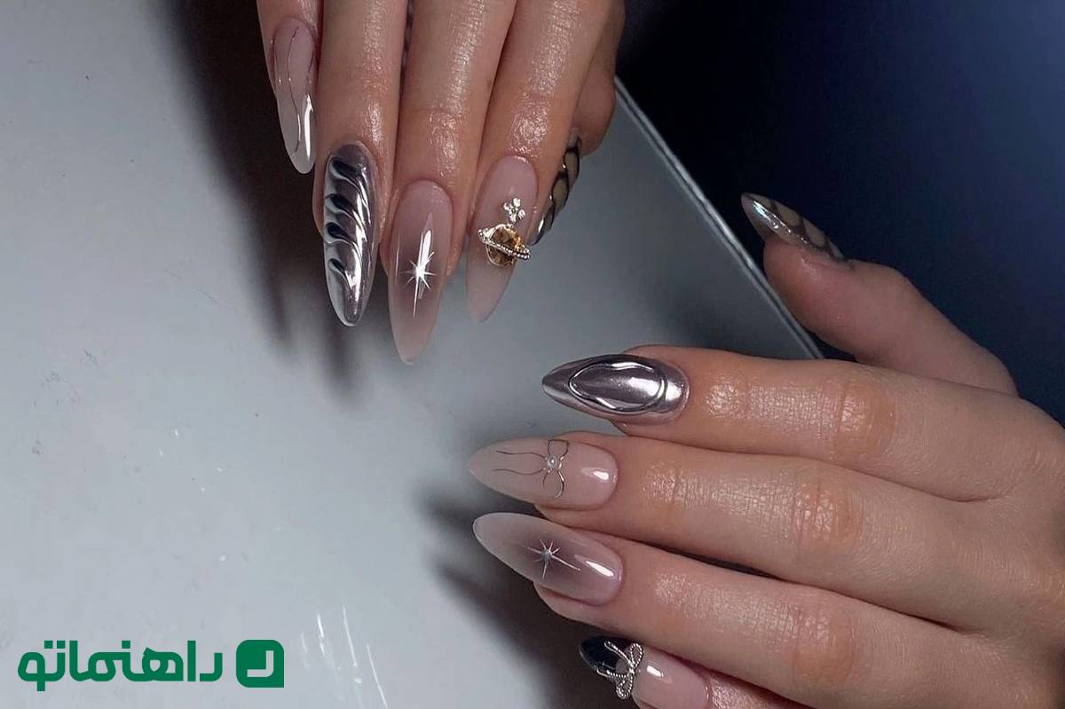 این خطوط اغلب بهصورت مینیمال و هندسی یا با الگوهای خلاقانه روی پایهای از رنگهای خنثی مانند سفید، صورتی کمرنگ یا nude کشیده میشوند و سبکی شیک، ظریف و امروزی به ناخنها میبخشند.در این مطلب از راهنمای شیک بودن ۵ مدل مناسب نوروز را به شما معرفی میکنیم که با طراحی خطوط نقرهای انجام شده است.