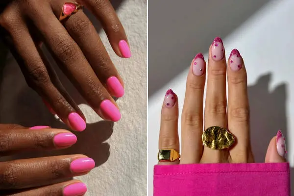 چرا به یک سایه صورتی بسنده کنید؟ طیفی از صورتی، از کمرنگترین تا صورتی تند و فوشیا، روی ناخنها به کار ببرید.