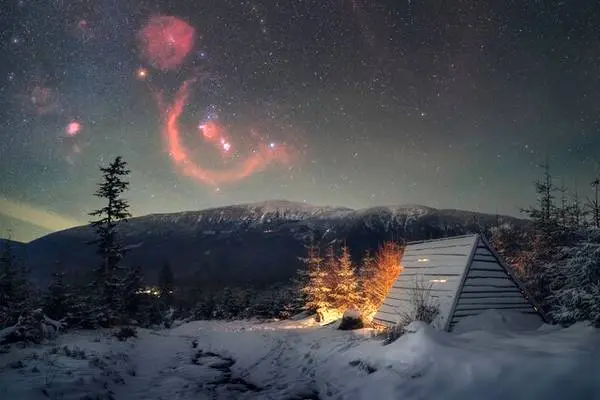 به نقل از ناسا، این صحنه زمستانی از جنوب لهستان در شب طولانی نیمکره شمالی گرفته شده است. سحابیهای غیرقابل دیدن در آسمان با دوربینی ثبت شدهاند که برای ثبت نور قرمز هیدروژن-آلفا اصلاح شده است.
