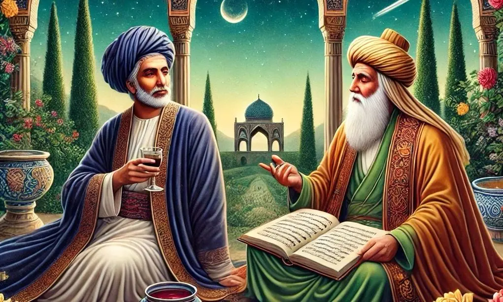 راهنماتو- خیام را به تلخی بیپردهاش در برابر زندگی میشناسند و حافظ را به نرمی و طعنهاش به روزگار؛ اما در پس این دو لحن متفاوت، هر دو شاعر در برابر جهانی پر از رنج، ناتوانی انسان و جبر تقدیر، همزبان میشوند. این گفتوگوی خیالی میان خیام و حافظ، بازتابی از همدلی پنهان دو ذهن بزرگ در برابر دردهای ناگزیر هستی است که بازتاب تفکر اشراقی حافظی و فیلسوفانه خیام است.