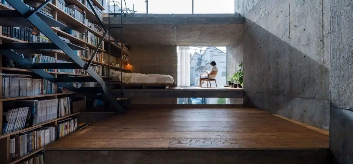 این خانه در توکیو که استودیوی ژاپنی IGArchitects آن را به شکل یک اتاق بزرگ طراحی کرده، فضایی را هم برای زندگی و هم برای کار فراهم کرده که با مناطق نشیمن پلکانی تقسیم شده است. دیوارهای بتنی علامت‌گذاری‌شده با تخته، فضای داخلی را پوشانده و با کف‌های چوبی و جزئیات فلزی نمایان شدند.