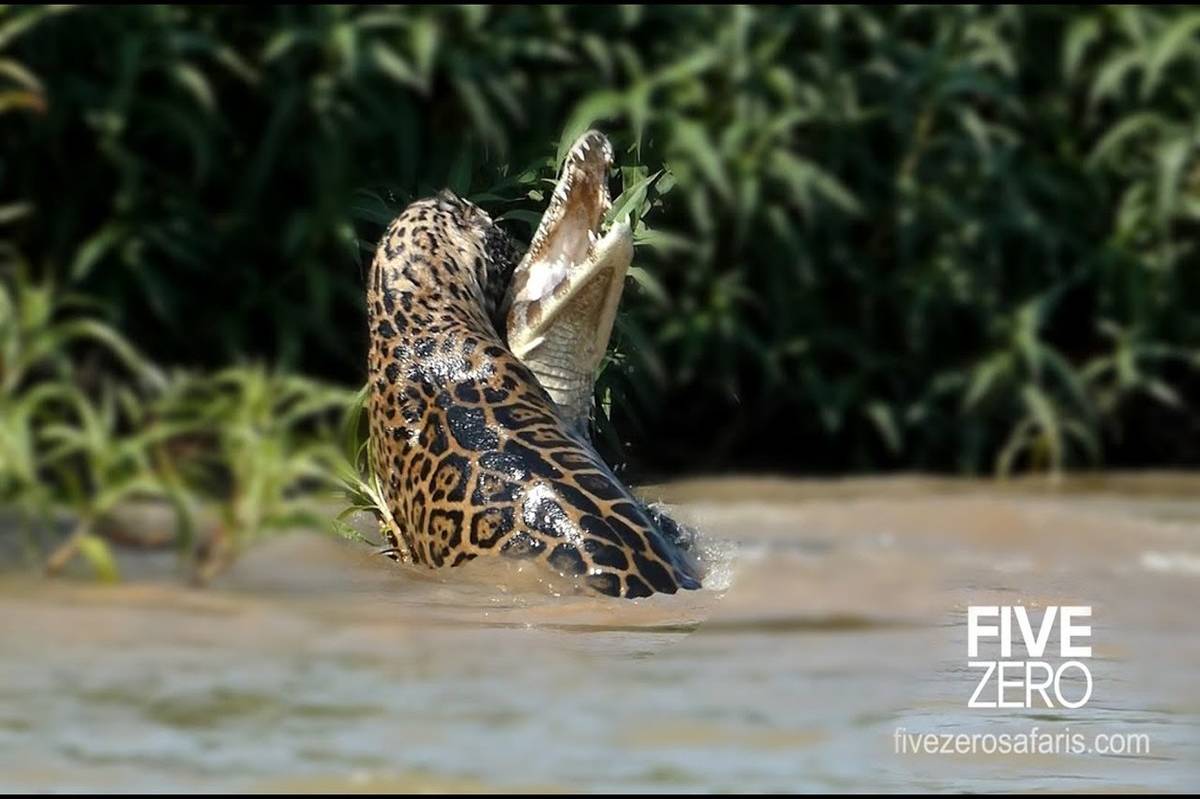 راهنماتو- هرکسی که برای تماشای جگوارها به مناطق جنگلی پانتانال برزیل میرود امیدوار است جگوارها را در حین شکار ببیند و ابیگیل مارتین زیست شناس آمریکایی خیلی خوش شانس بود که یکی از مهیجترین شکارهای جگوار را از نزدیک تماشا کرد. یک جگوار گرسنه با حمله به یک تمساح کایمن در رودخانه پانتانال برزیل پس از یک مبارزه دیدنی توانست آن را از زیر آب بیرون بکشد. قدرت آروارههای جگوار همراه با تواناییهای شنا در نهایت منجر به پیروزی شد.
