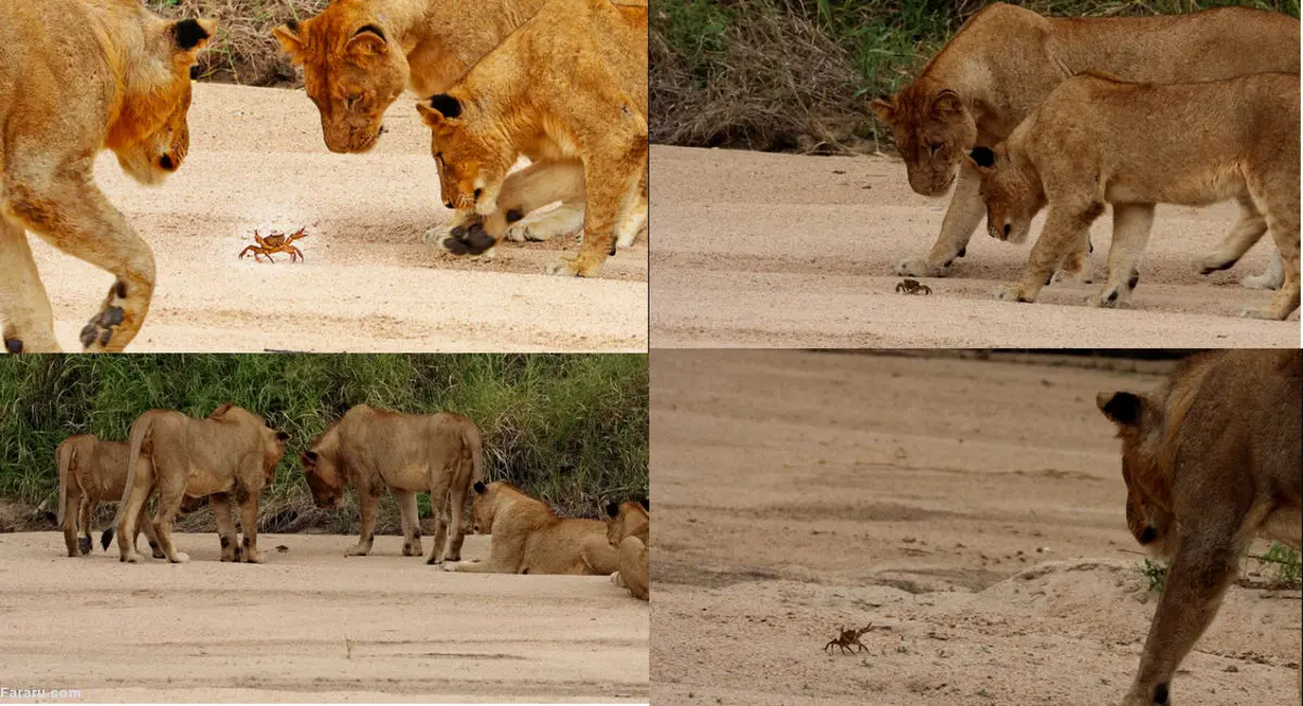 راهنماتو- یک خرچنگ که تلاش میکرد خود را به رودخانه برساند باعث کنجکاوی چند شیر شد. در ساحل رودخانه مالامالا در آفریقای جنوبی یک شیر هنگام عبور یک خرچنگ از مقابلش به تعقیب این سخت پوست ۱۰ سانتیمتری پرداخت. خرچنگ که احساس خطر کرده بود چنگالهای خود را به طرف شیر گرفته و تلاش میکرد تا دور شود.