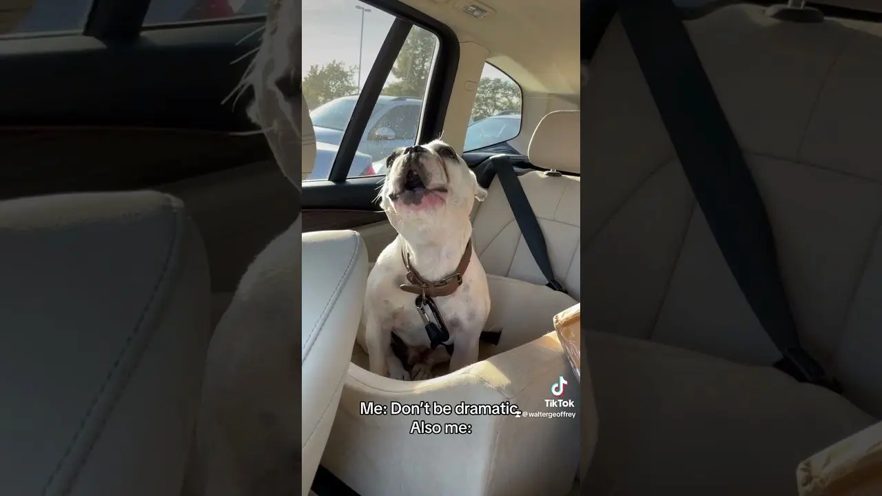 این سگ بخاطر اینکه او را در صندلی عقب خودرو قرار داده اند بسیار ناراحت است. در ابتدا بغض می کند و سپس به شکل خنده داری شروع به ناله می کند.