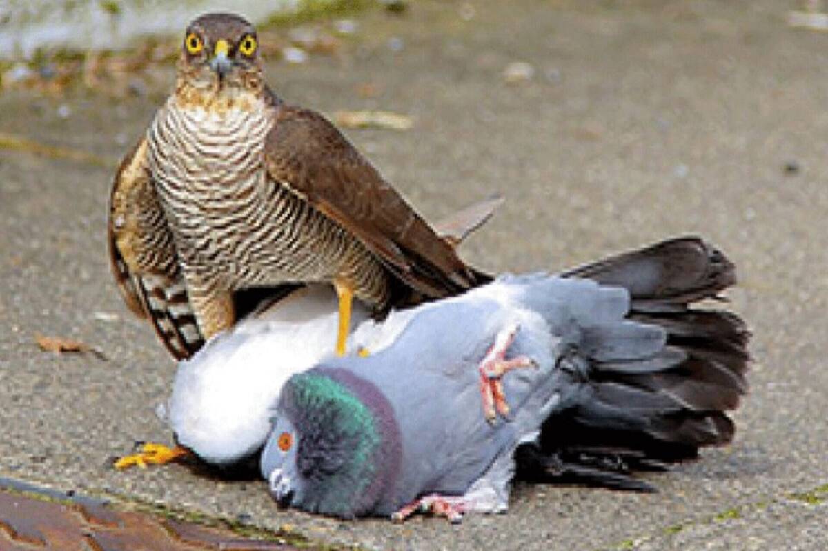 کبوتری با پای خود به لانه یک شاهین رفت و این پرنده شکارش کرد.