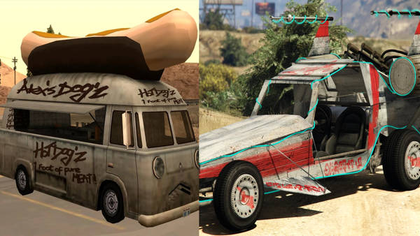 برای مورد آخر هم برمیگردیم به محبوبترین بازی این سری مخصوصا توی ایران که GTA San Andreas هستش. شما ماشین هاتداگ Alex's Dog'z رو میتونین در San Andreas پیدا کنین و ازشون هاتداگ بخرین تا مقداری از خون CJ رو بتونین برگردونین. این ماشین بر اساس اتوبوس VW Bus Vanagon طراحی شده و به نظر نمیاد که خیلی به تمیزی فکر کرده باشه چون قشنگ همه جاش میشه لک چربی و روغن رو دید؛ اگر دانشجو باشین احتمالا با ساندویچیهای این شکلی آشنایی دارن که معمولا اسم عامیانشون "اسم صاحب مغازه" کثیف هستن. تازه اگر کثیفیش به اندازه کافی خندهدار نبود قطعا شعار روی بدنه ماشین میتونه بسته به برداشت خودتون خیلی خندهدار باشه که میگه "1 Foot of Pure Meat" یا "30 سانت گوشت خالص"! این همون هیومری هستش که باید بگم Rockstar Games دوست داره تو بازیهاش استفاده کنه.