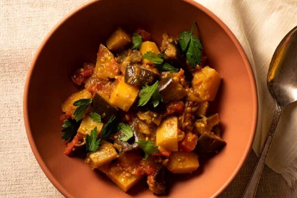 نمک و زردچوبه را اضافه کنید و در ظرف را بگذارید. حرارت را کم کنید تا بادمجانها با آب پیاز و گوجه فرنگی بپزند. در ۱۰ دقیقه پایانی، آبلیمو را اضافه کنید. برای پختن این غذا به ۳۰ تا ۴۰ دقیقه زمان نیاز دارید. هر از گاهی به غذا سر بزنید تا ته نگیرد.