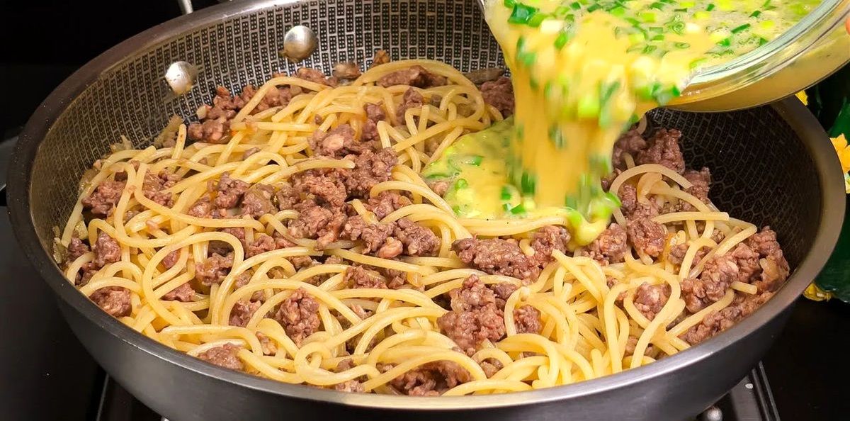 در این ویدئو یک آشپز آمریکایی با مواد اولیه شامل ۴۵۰ پرم گوشت چرخ کرده این پاستای ساده را طبخ می کند.