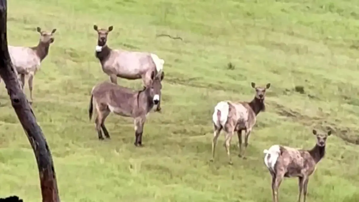 صاحبان یک الاغ اهلی که ۵ سال پیش در نزدیکی آبرن در ایالت آلابامای آمریکا گم شده بود، او را بر حسب تصادف در میان یک گله گوزن وحشی پیدا کردند.