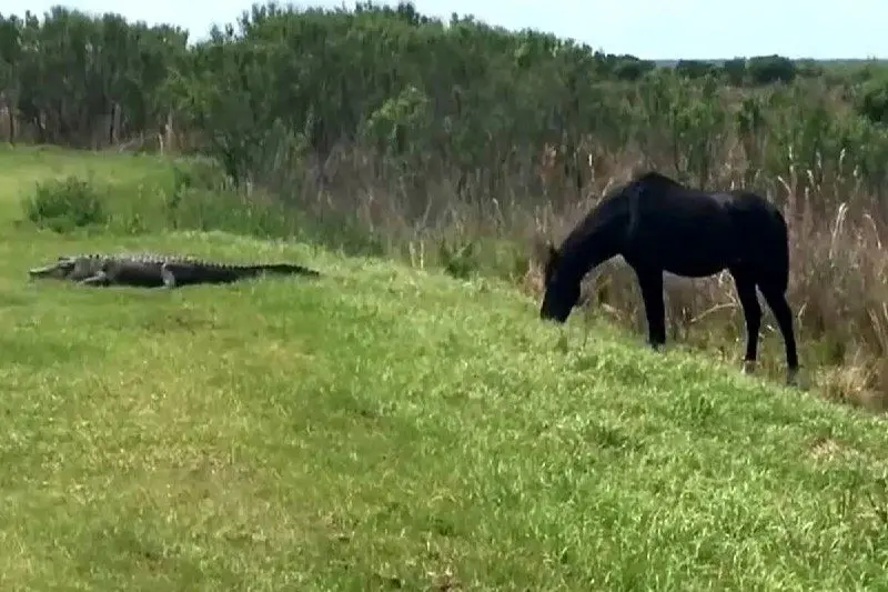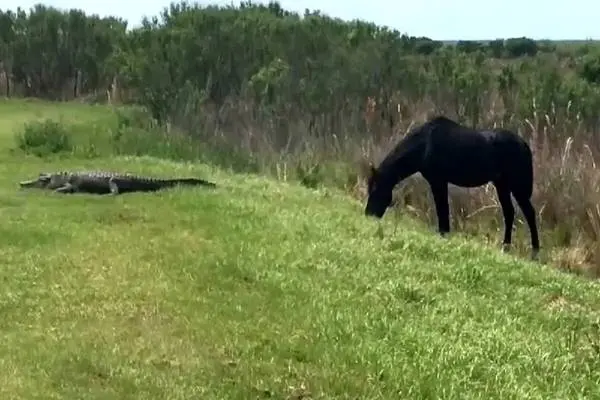 یک اسب شجاع که مشغول اسراحت بود، متوجه حضور یک تمساح طمعکار در نزدیکی خود شد و به سرعت به این حضور خطرناک، واکنش نشان داد و ضرباتی کاری به این تمساح وارد کرد.