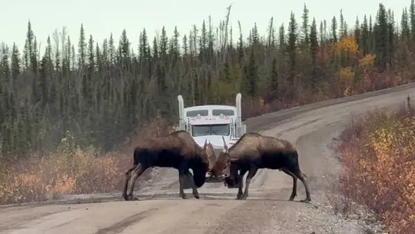 یک جفت گوزن موس نر در حالی که در جاده به مبارزه با یکدیگر پرداختند، یک کامیون را مجبور به توقف کردند. این ویدیو توسط شکارچیان کانادایی ضبط شده است. موس بزرگترین نوع گوزن از لحاظ هیکل است که در آمریکای شمالی و بخشهایی از اورسیا ساکن است و در شرق اروپا و خاورمیانه (از جمله ایران) منقرض شده است،