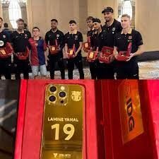 بن سلمان ولیعهد عربستان به بازیکنان بارسلونا آیفون طلا منقش به اسم و شماره بازیکنان هدیه داد. ویدئوی لحظه هدیه بنسلمان ولیعهد عربستان به بازیکنان بارسلونا آیفون با قاب طلا را ببینید.